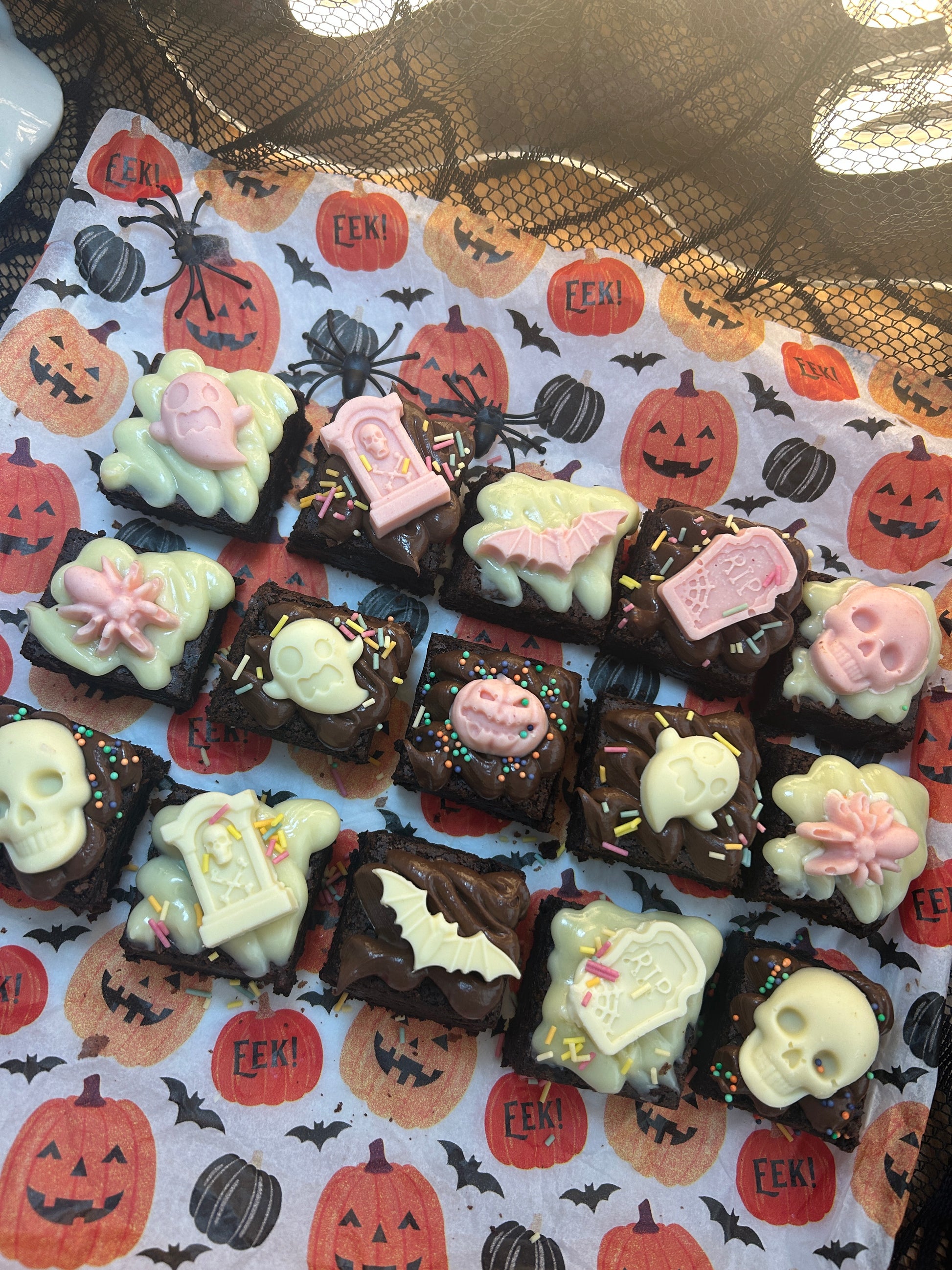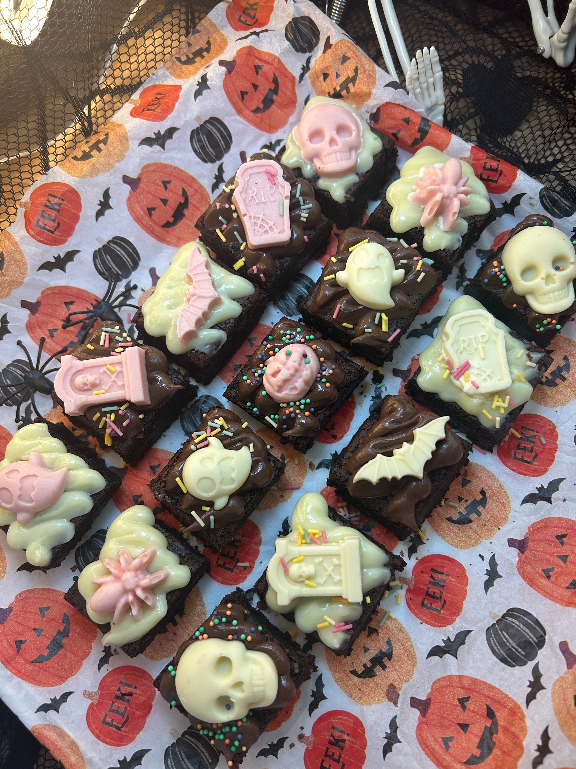 Brownies with a spooky Pink twist! This box is packed with fudgy brownies topped with white and pink chocolate skulls, gravestones, bats, and pumpkins. Each bite is decorated with Nutella and sprinkles, making them the cutest (and tastiest) treats for trick-or-treaters, party platters, or just for nibbling all to yourself.